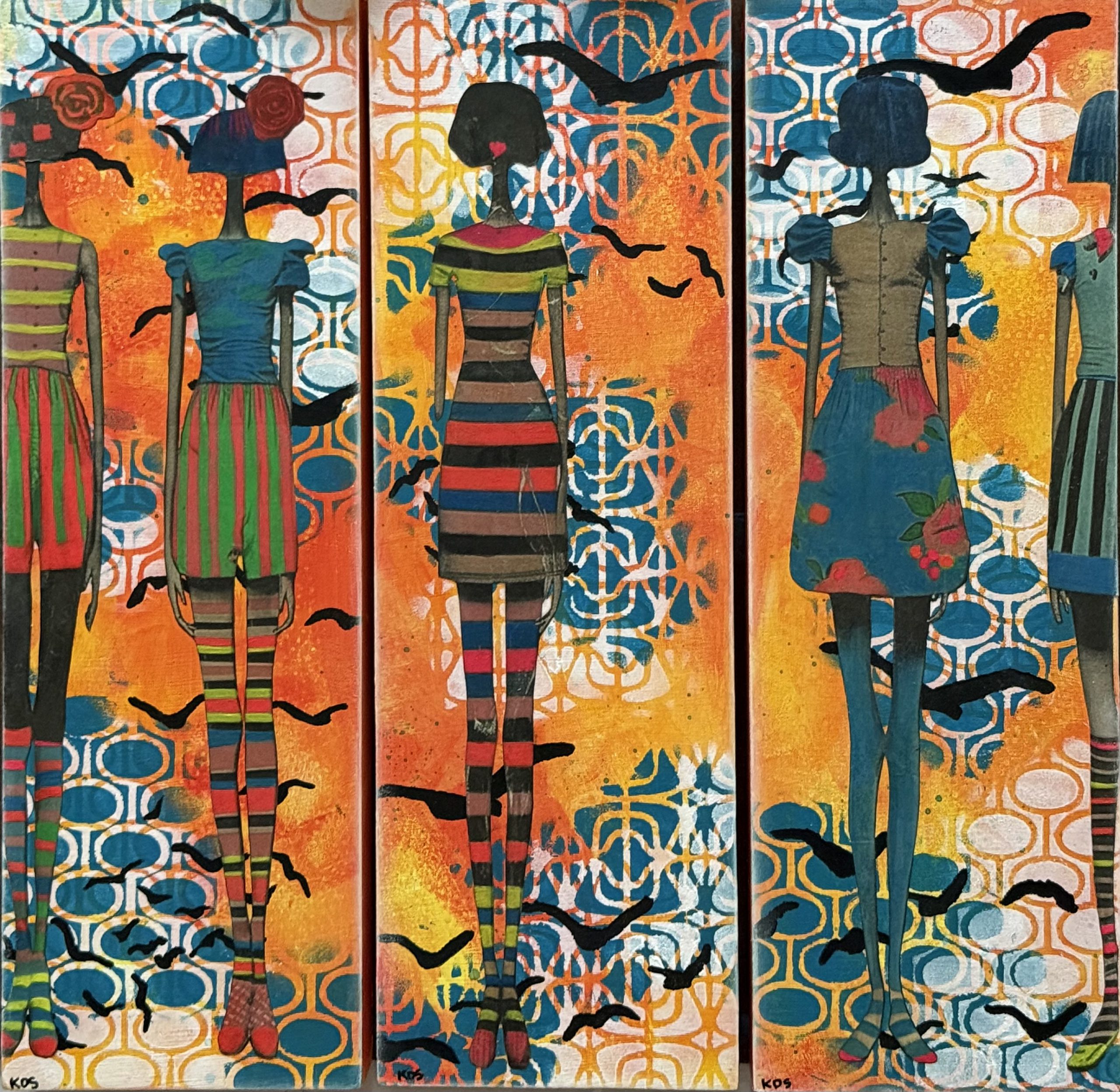 acrylic and collage triptych (individual panels - 12"x4"; entire piece - 12"x12")
